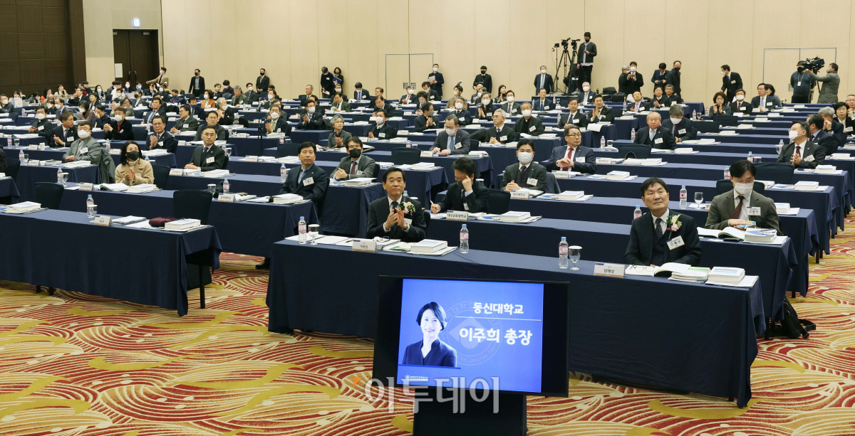 31일 서울 서초구 더케이호텔에서 열린 한국대학교육협의회 2023년 정기총회에서 전국 대학 총장들이 박수를 치고 있다.