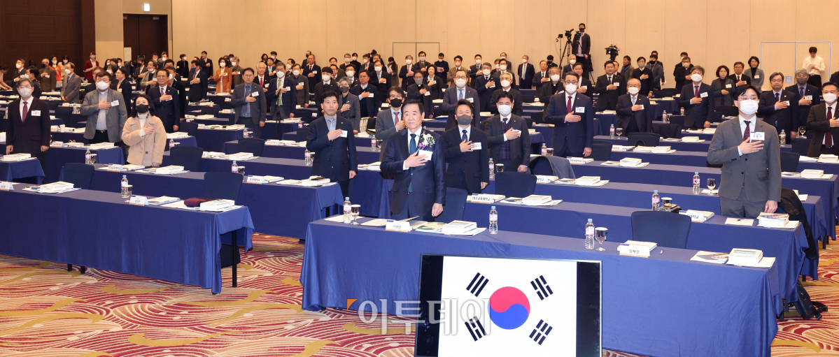 31일 서울 서초구 더케이호텔에서 열린 한국대학교육협의회 2023년 정기총회에서 전국 대학 총장들이 국민의례를 하고 있다.
