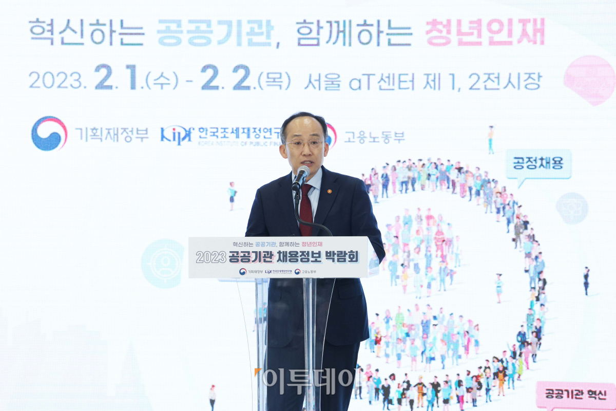 추경호 부총리 겸 기획재정부 장관이 1일 서울 서초구 aT센터에서 열린 ‘2023 공공기관 채용정보박람회’에서 개회사를 하고 있다. 공공기관 채용정보박람회는 전국 138개 공공기관이 모여 구직자에게 채용정보와 취업노하우 등을 제공하는 행사로, 코로나19로 인해 온라인행사로 전환된 이후 3년 만에 오프라인 행사로 재개됐다.
