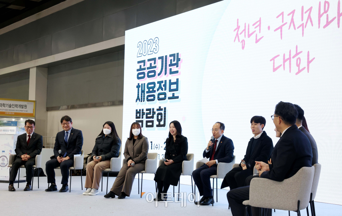 추경호 부총리 겸 기획재정부 장관이 1일 서울 서초구 aT센터에서 열린 ‘2023 공공기관 채용정보박람회’에서 청년·구직자와의 대화 시간을 갖고 있다. 공공기관 채용정보박람회는 전국 138개 공공기관이 모여 구직자에게 채용정보와 취업노하우 등을 제공하는 행사로, 코로나19로 인해 온라인행사로 전환된 이후 3년 만에 오프라인 행사로 재개됐다.