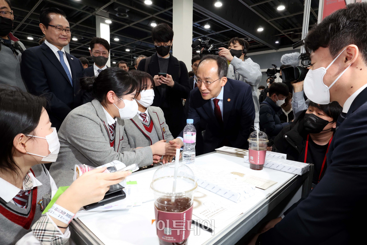 추경호 부총리 겸 기획재정부 장관이 1일 서울 서초구 aT센터에서 열린 ‘2023 공공기관 채용정보박람회’에서 학생 취업 준비생들을 격려하고 있다. 공공기관 채용정보박람회는 전국 138개 공공기관이 모여 구직자에게 채용정보와 취업노하우 등을 제공하는 행사로, 코로나19로 인해 온라인행사로 전환된 이후 3년 만에 오프라인 행사로 재개됐다.