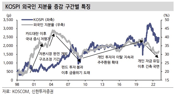 결국, 외인 수급 속도는 펀더멘털이 결정할 것으로 봤다. 그는 "외인 지분율이 확대됐던 시기는 대체로 펀더멘털이 견조했거나, 밸류에이션 상 저평가 메리트가 부각됐다"며 "현재로써는 지분율로는 외인 수급 확대 여지는 있고, 속도는 펀더멘털이 결정할 것으로 본다"고 했다.