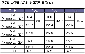 경소형차 신규등록비중은 지난 2006년만 하더라도 28.1%였으나 2007년에는 30.7%으로 소폭 상승했으며 지난해에는 36.6%로 급증했다.