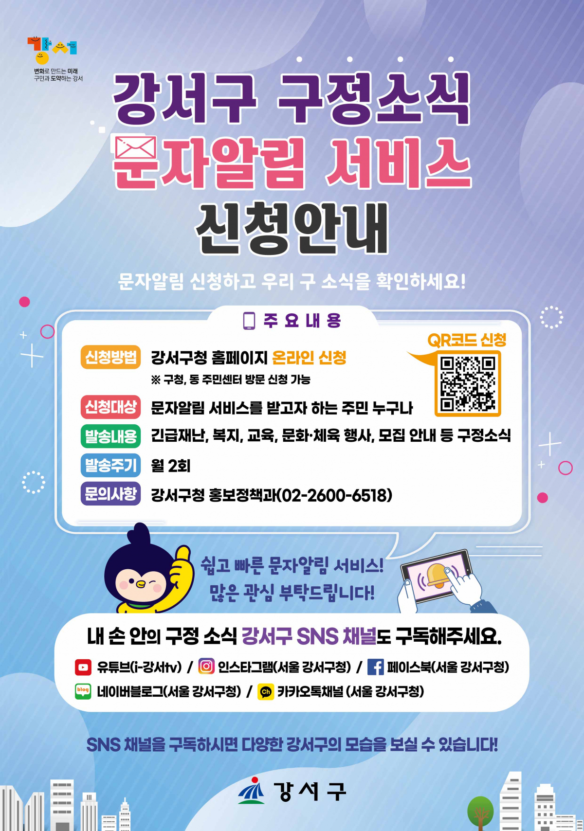 문자알림 서비스를 받고 싶은 구민이면 누구나 신청할 수 있다. '강서구 누리집-강서소식-구정소식 알림 신청'에서 온라인으로 신청하거나 동 주민센터에 방문 신청하면 된다.
