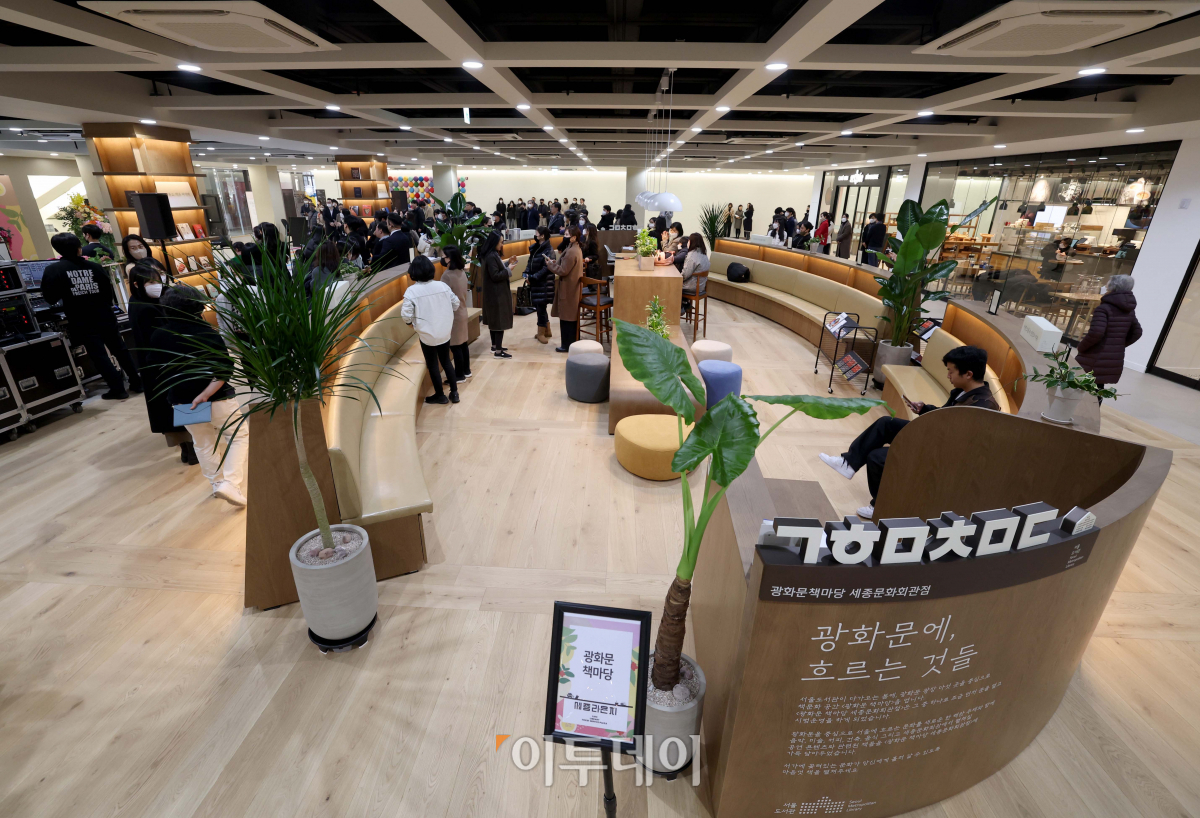 7일 서울 종로구 세종문화회관에 북카페형 편의공간 ‘세종라운지’가 개장한 가운데 라운지가 시민들로 붐비고 있다. 세종라운지는 과거 행사장으로 주로 이용됐던 ‘세종홀’을 재구조화한 공간이다. ‘광화문 책마당 세종문화회관점’과 베이커리카페, 모든 공연과 전시 프로그램의 입장권을 구매할 수 있는 ‘서비스플라자’를 갖춘, 열린 문화 공간으로 조성됐다. 세종라운지는 광화문역과 광화문광장, 세종문화회관을 유기적으로 잇는 통로 역할도 한다.