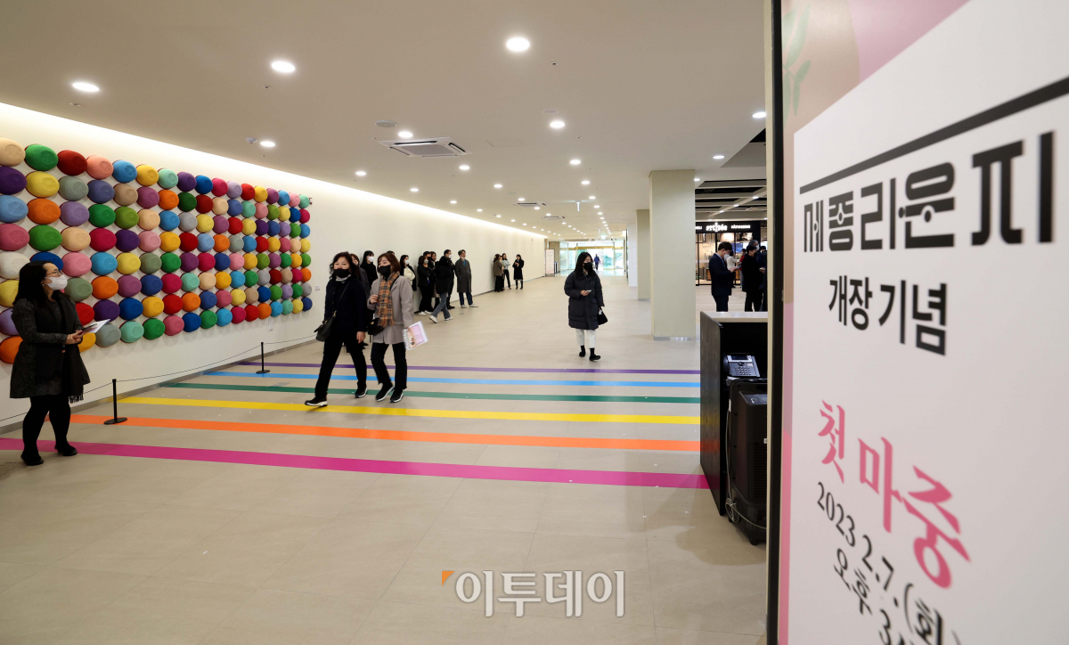 7일 서울 종로구 세종문화회관에 북카페형 편의공간 ‘세종라운지’가 개장한 가운데 라운지를 시민들이 오가고 있다. 세종라운지는 과거 행사장으로 주로 이용됐던 ‘세종홀’을 재구조화한 공간이다. ‘광화문 책마당 세종문화회관점’과 베이커리카페, 모든 공연과 전시 프로그램의 입장권을 구매할 수 있는 ‘서비스플라자’를 갖춘, 열린 문화 공간으로 조성됐다. 세종라운지는 광화문역과 광화문광장, 세종문화회관을 유기적으로 잇는 통로 역할도 한다.