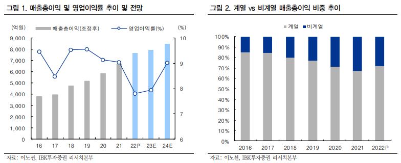 또 “영업이익률(GPM 기준)은 21.5%로 소폭 개선에 그쳤다”며 “본사 비계열 전담 조직 확대와 디지털 관련 인력 충원에 따른 인건비 상승과 코로나 완화로 인한 출장비 증가 및 ERP시스템 구축 등의 비용 부담이 동반된 영향”이라고 봤다.