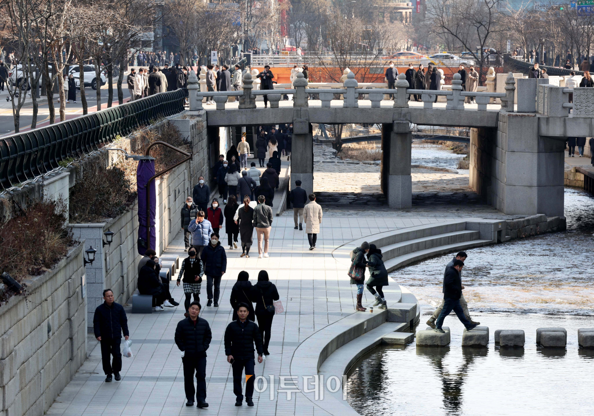 평년 기온을 웃도는 온화한 날씨를 보인 8일 서울 청계천 산책로에서 시민들이 발걸음을 옮기고 있다.