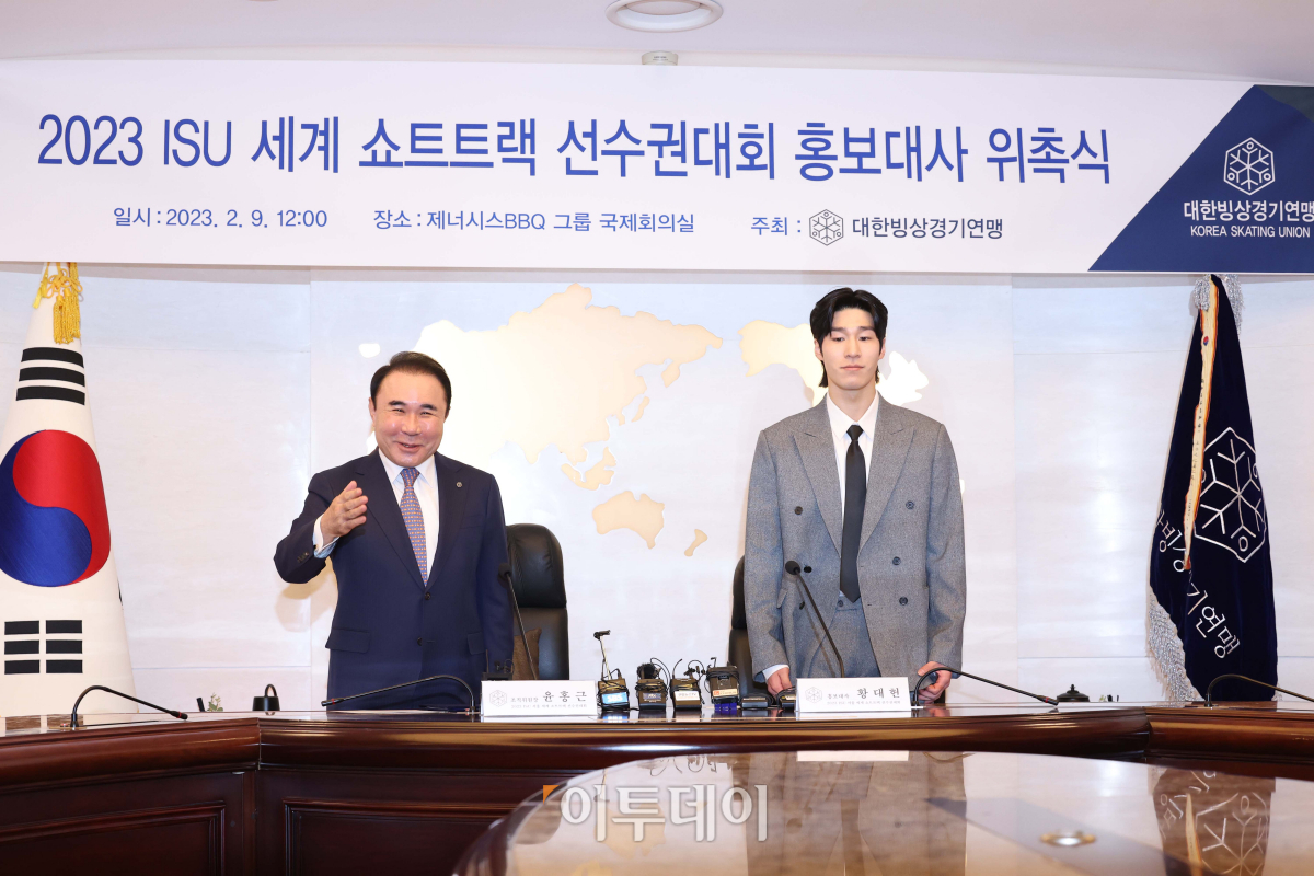 9일 서울 송파구 제너시스BBQ 본사에서 열린 ‘2023 ISU 서울 세계 쇼트트랙 선수권대회 홍보대사 위촉식’에서 대회 조직위원장인 윤홍근 제너시스BBQ그룹 회장이 인사말을 하고 있다.