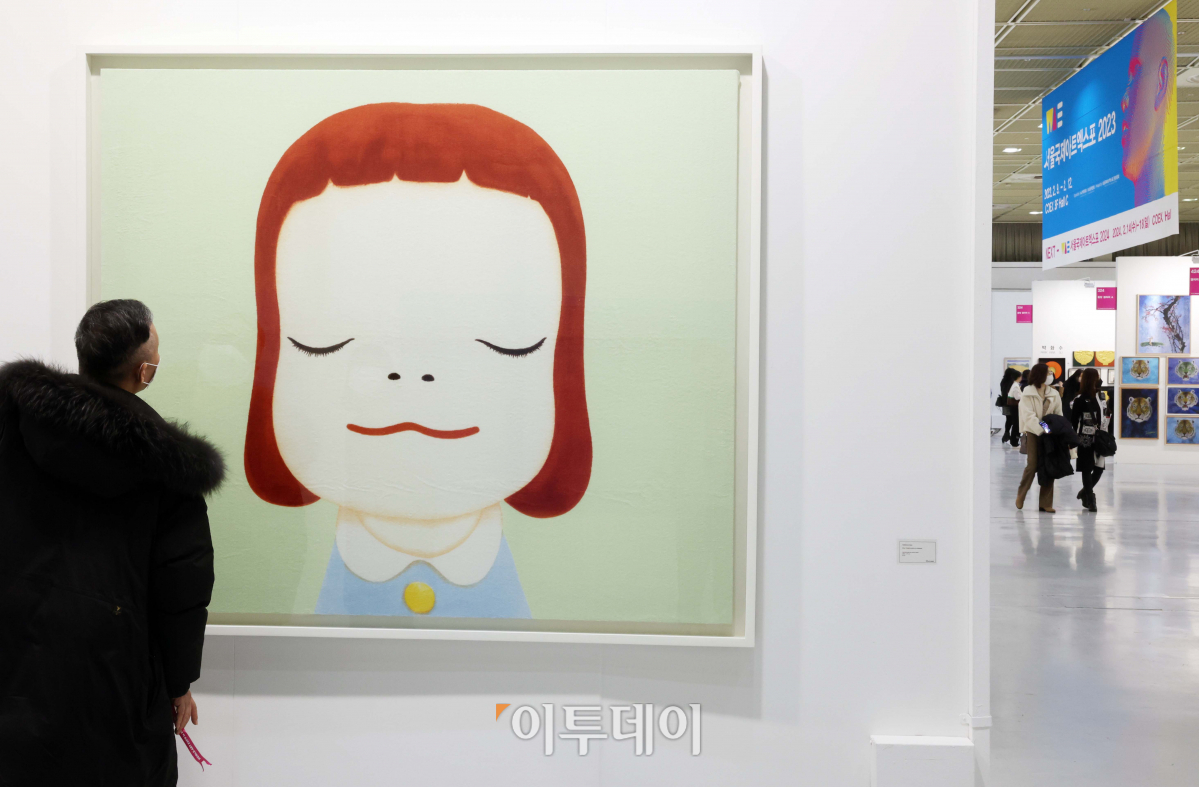 9일 서울 강남구 코엑스에서 열린 ‘2023 서울국제아트엑스포(WORLD ART EXPO in SEOUL 2023)’에서 참관객들이 작품을 감상하고 있다. 서울국제아트엑스포는 새로운 미술 산업을 발굴하고 갤러리와 작가들의 작품을 대중에게 소개하는 전시회다.
