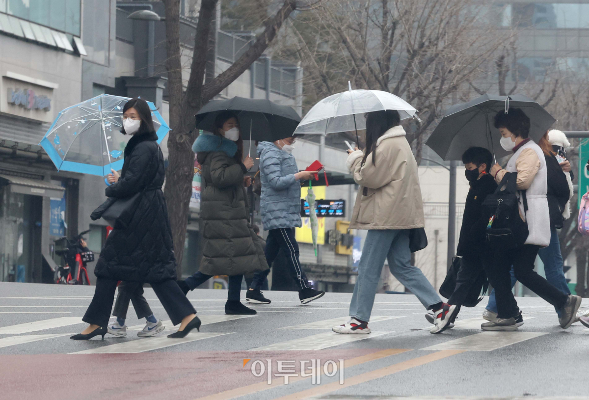 전국 대부분 지역에 비가 내린 10일 오전 서울의 한 거리에서 우산을 쓴 시민들이 발걸음을 옮기고 있다.