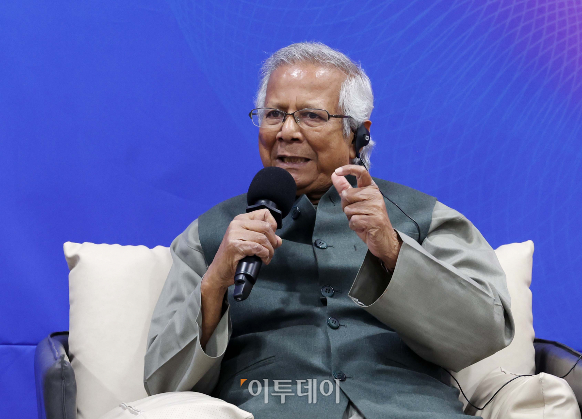무하마드 유누스 유누스 센터 의장이 13일 서울시청에서 ‘약자와의 동행’을 주제로 오세훈 서울시장과 서울시 비전을 논의하는 대담을 갖고 있다.