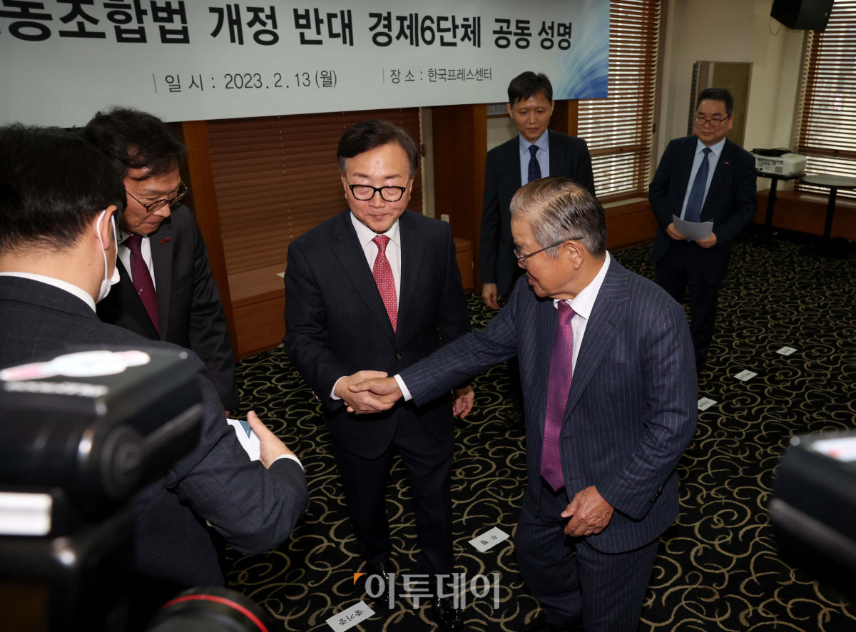 이동근(왼쪽) 한국경영자총협회 부회장과 권태신 전국경제인연합회 부회장이 13일 서울 중구 프레스센터에서 노동조합법 개정 반대 경제 6단체 공동 성명서를 발표한 뒤 인사하고 있다.