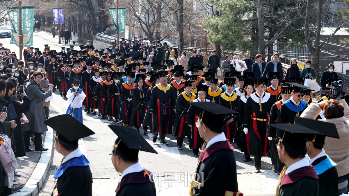 15일 서울 종로구 성균관대에서 열린 2023 겨울 학위수여식에서 졸업생들이 경사스러운 일이 있을 때 선현들에게 알리는 의식인 고유례를 지낸 뒤 졸업식장으로 향하고 있다.