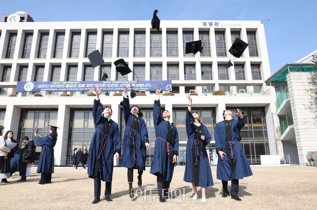 15일 서울 종로구 성균관대에서 열린 2023 겨울 학위수여식에서 졸업생들이 학사모를 던지고 있다.