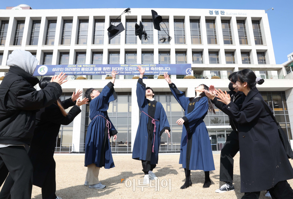 15일 서울 종로구 성균관대에서 열린 2023 겨울 학위수여식에서 졸업생들이 학사모를 던지고 있다.