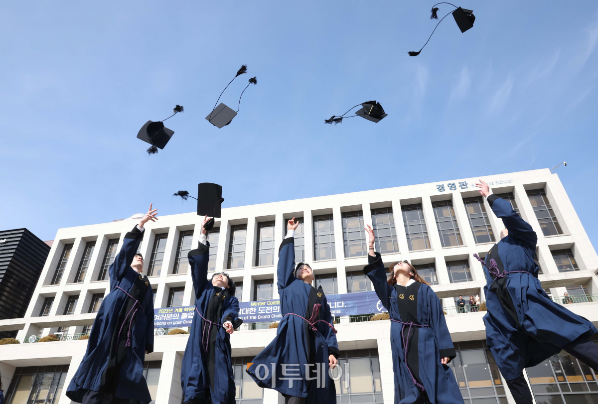 15일 서울 종로구 성균관대에서 열린 2023 겨울 학위수여식에서 졸업생들이 학사모를 던지고 있다.