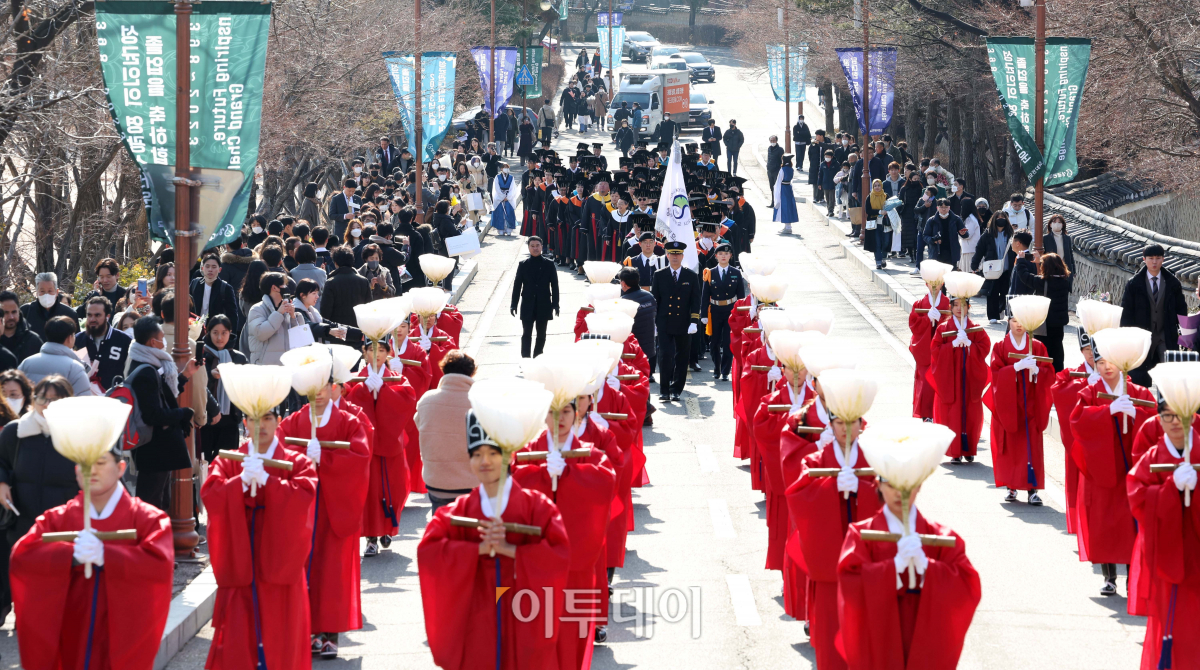 15일 서울 종로구 성균관대에서 열린 2023 겨울 학위수여식에서 졸업생들이 경사스러운 일이 있을 때 선현들에게 알리는 의식인 고유례를 지낸 뒤 졸업식장으로 향하고 있다.