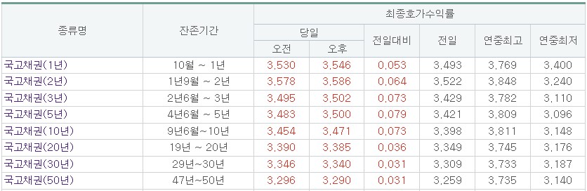 이날 서울 채권시장에서 3년 만기 국고채 금리는 전 거래일 대비 0.073%포인트 오른 연 3.502%에 거래를 마쳤다.