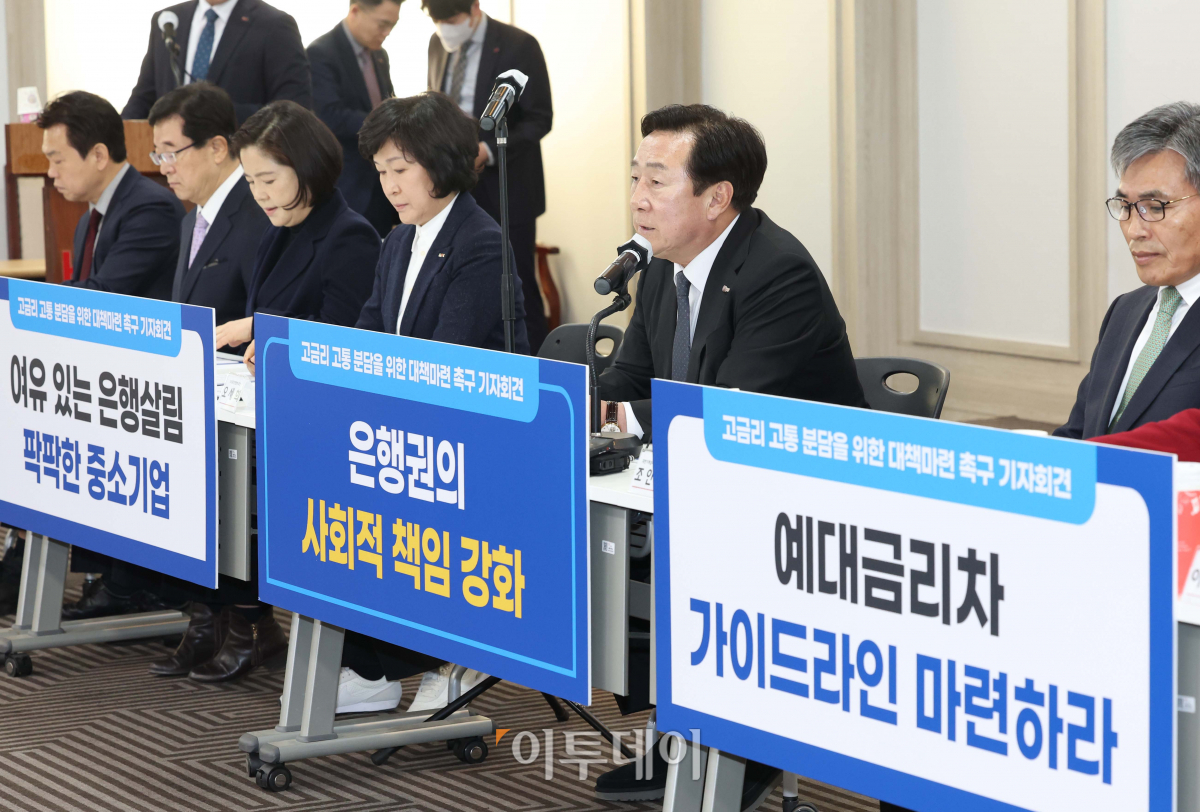김기문 중소기업중앙회장이 20일 서울 여의도 중기중앙회에서 열린 ‘고금리 고통 분담을 위한 대책마련 촉구 기자회견’에서 모두발언을 하고 있다. 중소기업계는 고금리로 힘들어하는 중소기업과 소상공인을 위해 금융권이 고통 분담에 적극 나설 것을 촉구했다.