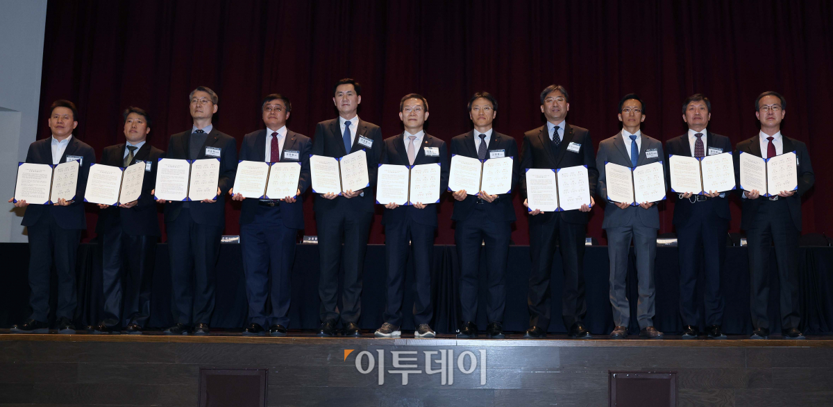 이종호(가운데) 과학기술정보통신부 장관이 ‘K-네트워크 2030 전략’ 관련 현장 방문차 20일 서울 서초구 삼성전자 서울R&D캠퍼스를 찾아 권준혁 LG유플러스 부사장, 강종렬 SKT 사장, 전경훈 삼성전자 사장, 김병훈 LG전자 CTO, 서창석 KT 네트워크부문장 등 업계 관계자들과 차세대 네트워크 모범국가 실현을 위한 상생협력 협약을 체결한 뒤 기념촬영을 하고 있다.
