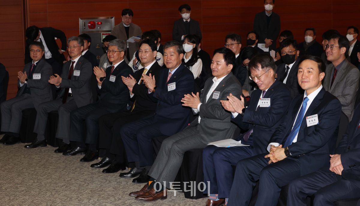 원희룡 국토교통부 장관이 22일 서울 중구 포스트타워에서 열린 ‘알뜰교통카드 플러스’ 협약식에서 관계기관장, 카드사 대표들과 박수를 치고 있다.