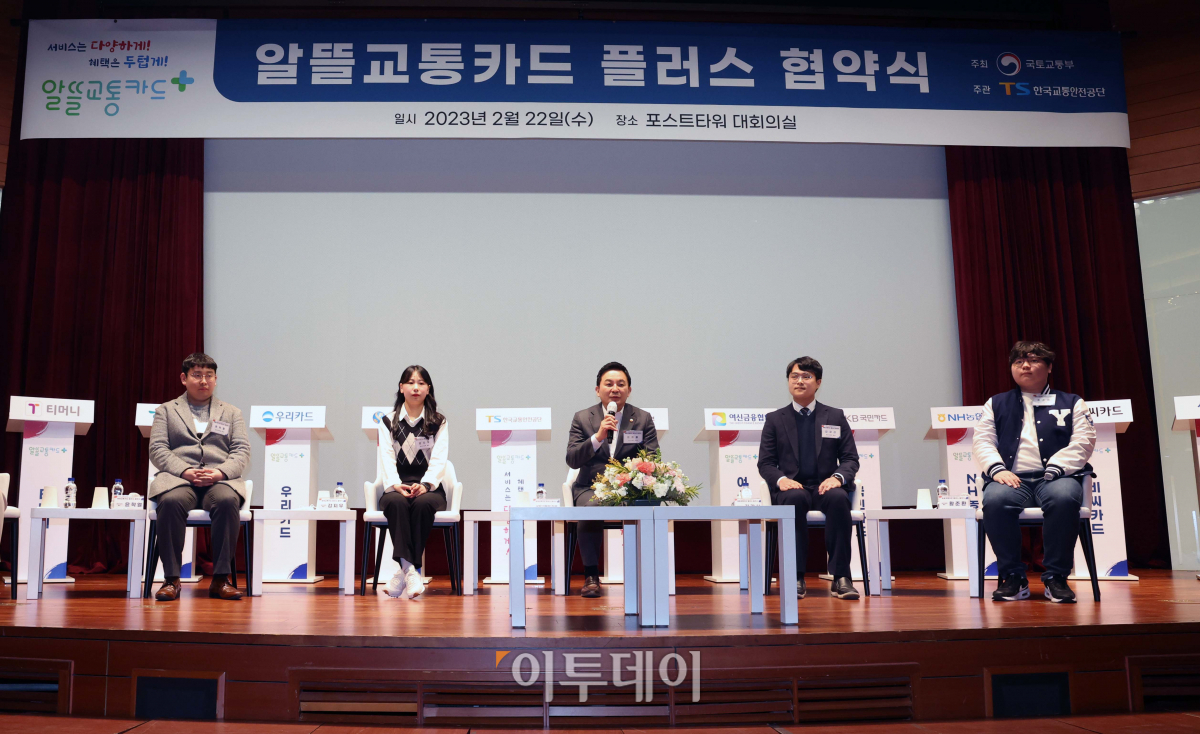 원희룡 국토교통부 장관이 22일 서울 중구 포스트타워에서 열린 ‘알뜰교통카드 플러스’ 협약식에서 알뜰교통카드를 이용하는 청년들과 대화하고 있다.