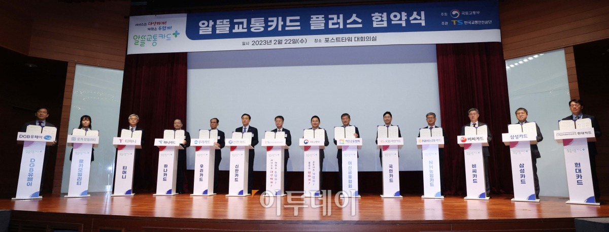원희룡 국토교통부 장관이 22일 서울 중구 포스트타워에서 열린 ‘알뜰교통카드 플러스’ 협약식에서 관계기관장, 카드사 대표들과 협약서를 들어보이고 있다.