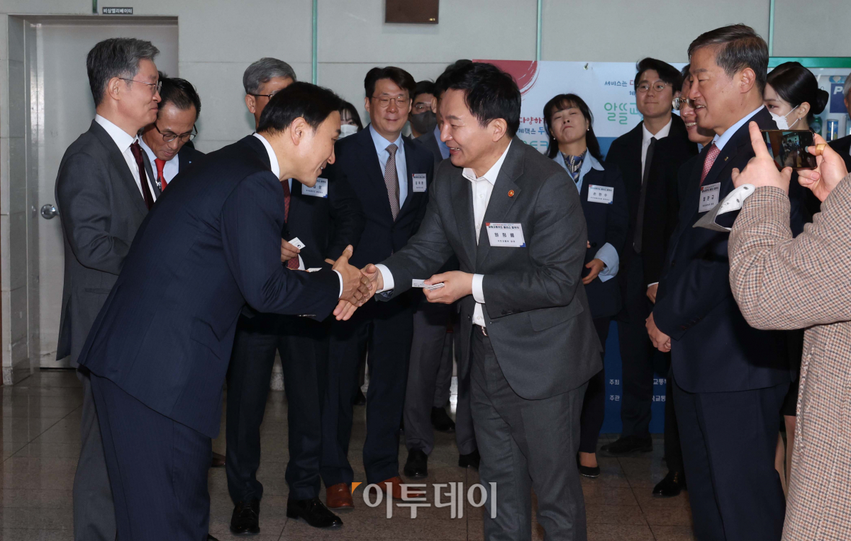 원희룡 국토교통부 장관이 22일 서울 중구 포스트타워에서 열린 ‘알뜰교통카드 플러스’ 협약식에서 관계기관장, 카드사 대표들과 인사하고 있다.