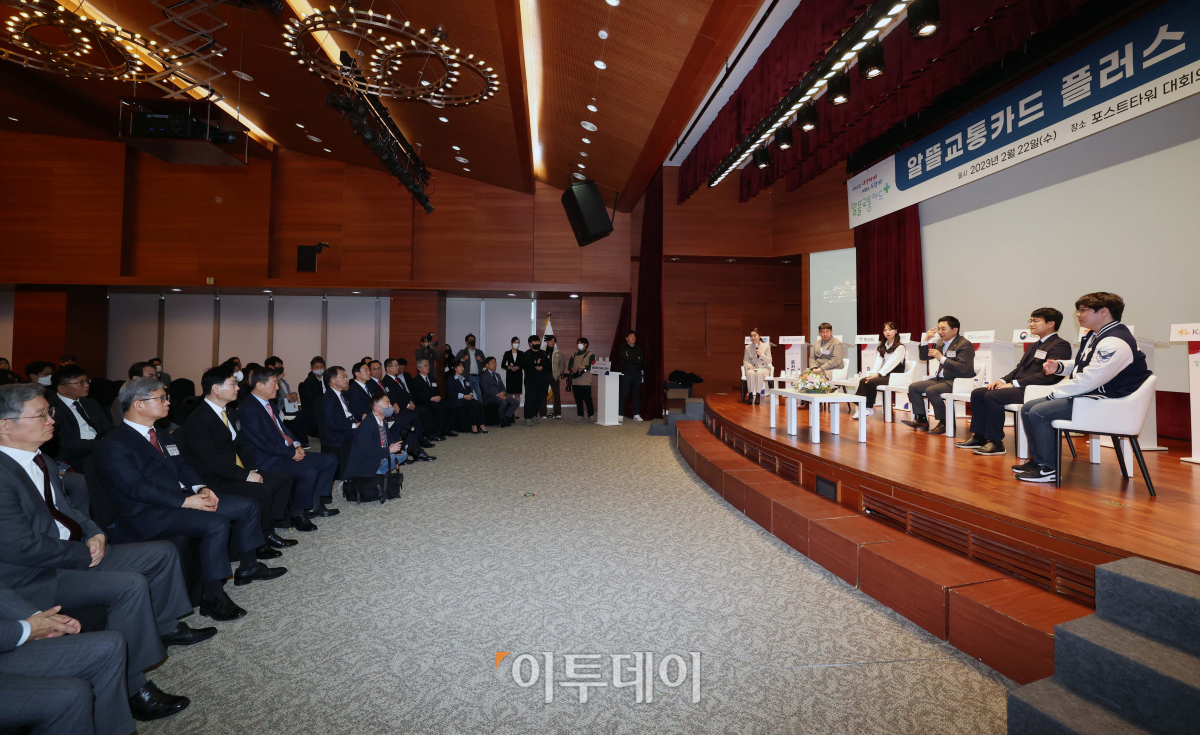 원희룡 국토교통부 장관이 22일 서울 중구 포스트타워에서 열린 ‘알뜰교통카드 플러스’ 협약식에서 알뜰교통카드를 이용하는 청년들과 대화하고 있다.