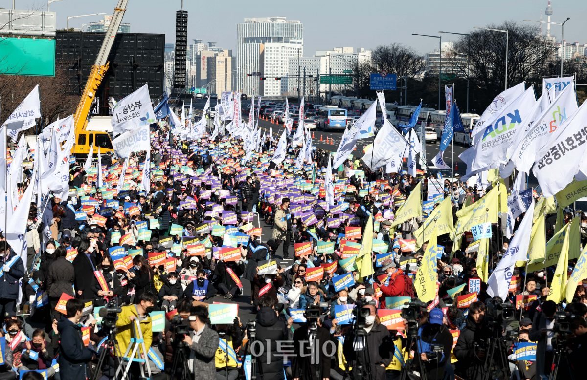 26일 서울 여의대로에서 대한의사협회 및 13개 보건의료 직역단체들이 모인 보건복지의료연대가 국회 본회의 상정을 앞둔 간호법 및 의료인면허법에 대해 반대하는 총궐기대회를 갖고 있다.