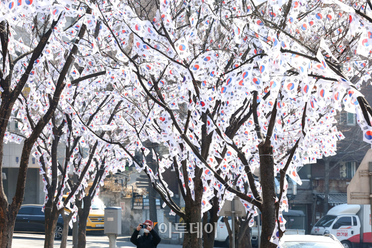 제104주년 삼일절을 이틀 앞둔 27일 서울 용산구 효창공원 앞에 태극기 거리가 조성돼 있다. 용산구는 삼일절을 기념하고 애국선열의 독립운동 정신을 기리기 위해 지하철 6호선 효창공원앞역~효창공원 구간 가로등과 가로수에 태극기를 게양해 태극기 거리를 연출했다. 태극기 거리는 내달 5일까지 이어진다.