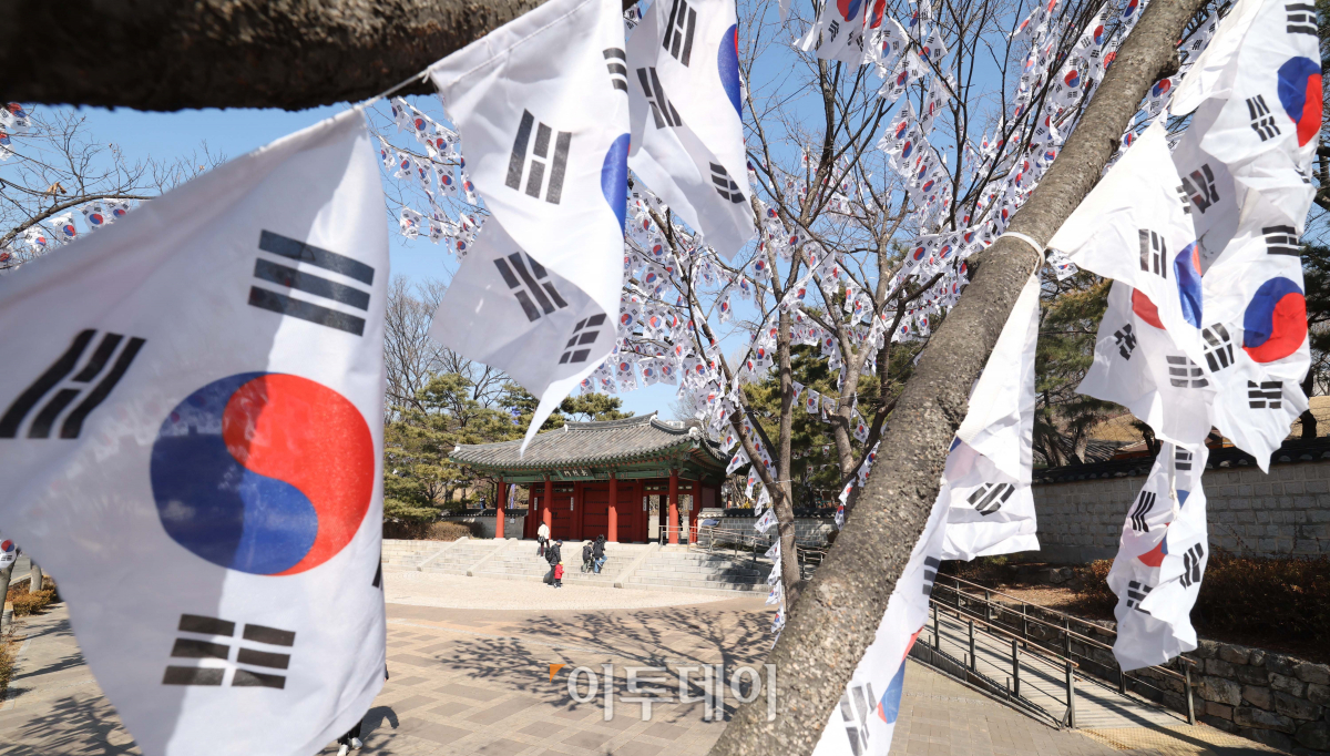 제104주년 삼일절을 이틀 앞둔 27일 서울 용산구 효창공원 앞에 태극기 거리가 조성돼 있다. 용산구는 삼일절을 기념하고 애국선열의 독립운동 정신을 기리기 위해 지하철 6호선 효창공원앞역~효창공원 구간 가로등과 가로수에 태극기를 게양해 태극기 거리를 연출했다. 태극기 거리는 내달 5일까지 이어진다.