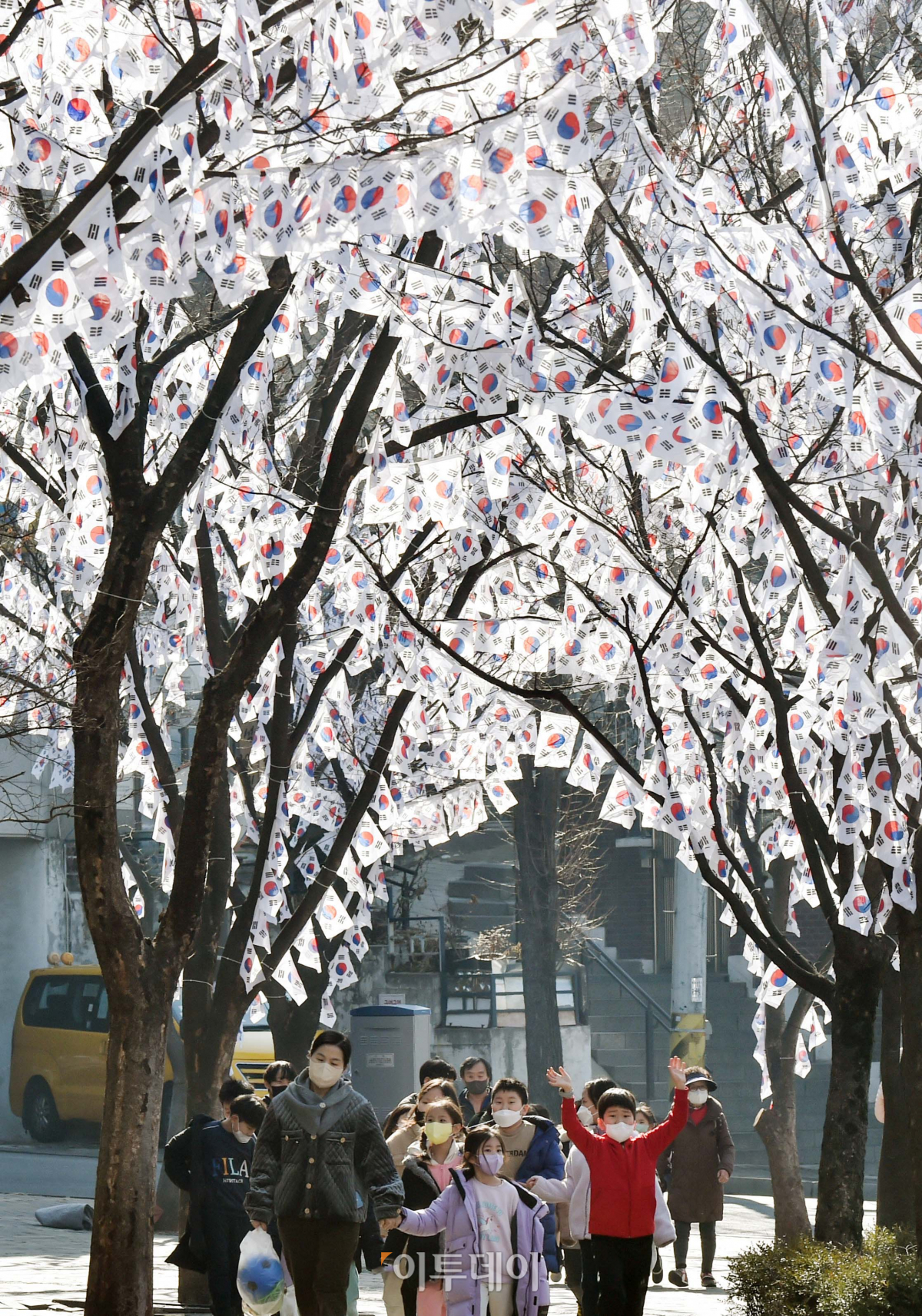 제104주년 삼일절을 이틀 앞둔 27일 서울 용산구 효창공원 앞에 태극기 거리가 조성돼 있다. 용산구는 삼일절을 기념하고 애국선열의 독립운동 정신을 기리기 위해 지하철 6호선 효창공원앞역~효창공원 구간 가로등과 가로수에 태극기를 게양해 태극기 거리를 연출했다. 태극기 거리는 내달 5일까지 이어진다.