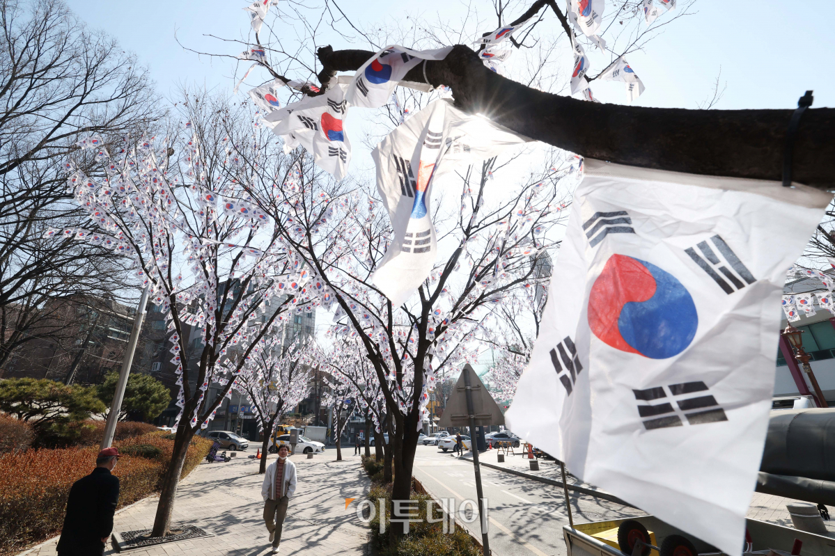 제104주년 삼일절을 이틀 앞둔 27일 서울 용산구 효창공원 앞에 태극기 거리가 조성돼 있다. 용산구는 삼일절을 기념하고 애국선열의 독립운동 정신을 기리기 위해 지하철 6호선 효창공원앞역~효창공원 구간 가로등과 가로수에 태극기를 게양해 태극기 거리를 연출했다. 태극기 거리는 내달 5일까지 이어진다.