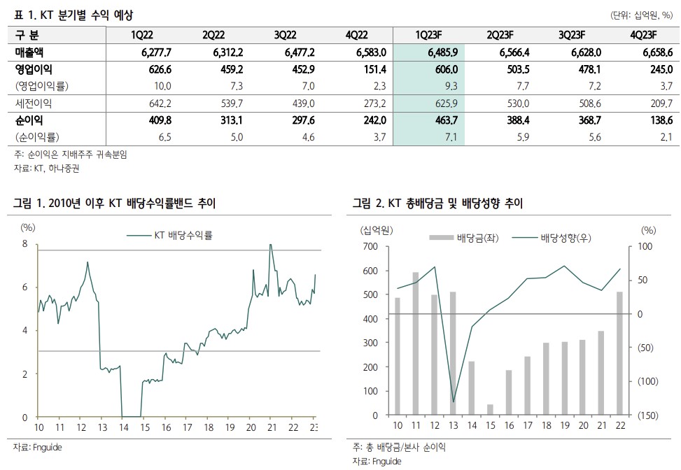 특히 "배당이 특히 큰 문제인데 현재의 주주이익환원 정책이 향후 유지된다고 해도 2023년 추정 실적 기준 기대 배당수익률이 6.7%로 3사 중 가장 낮다"며 "SKT 7.4%, LGU+가 7.0%라는 것을 감안 시 KT 주가 락바텀은 기대 배당수익률 8% 선인 2만5000원 수준으로 예상된다. 7% 선인 28,000원에서 지지하면 좋겠지만 과거 사례를 보면 SKT 기대 배당수익률보다 높아져야 안심구간"이라고 했다.