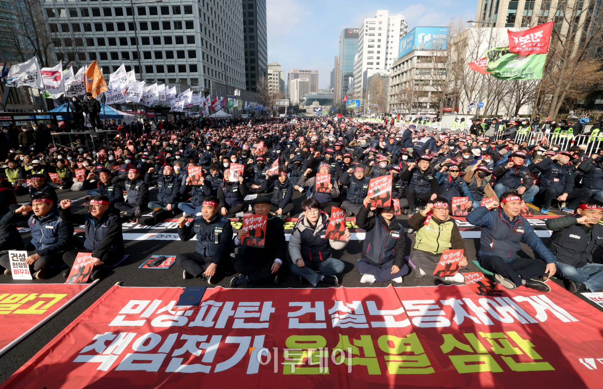 28일 서울 세종대로 일대에서 전국민주노동조합총연맹(민주노총) 전국건설노동조합 조합원들이 ‘건설노조 탄압 규탄 민주노총 결의대회’를 갖고 있다.
