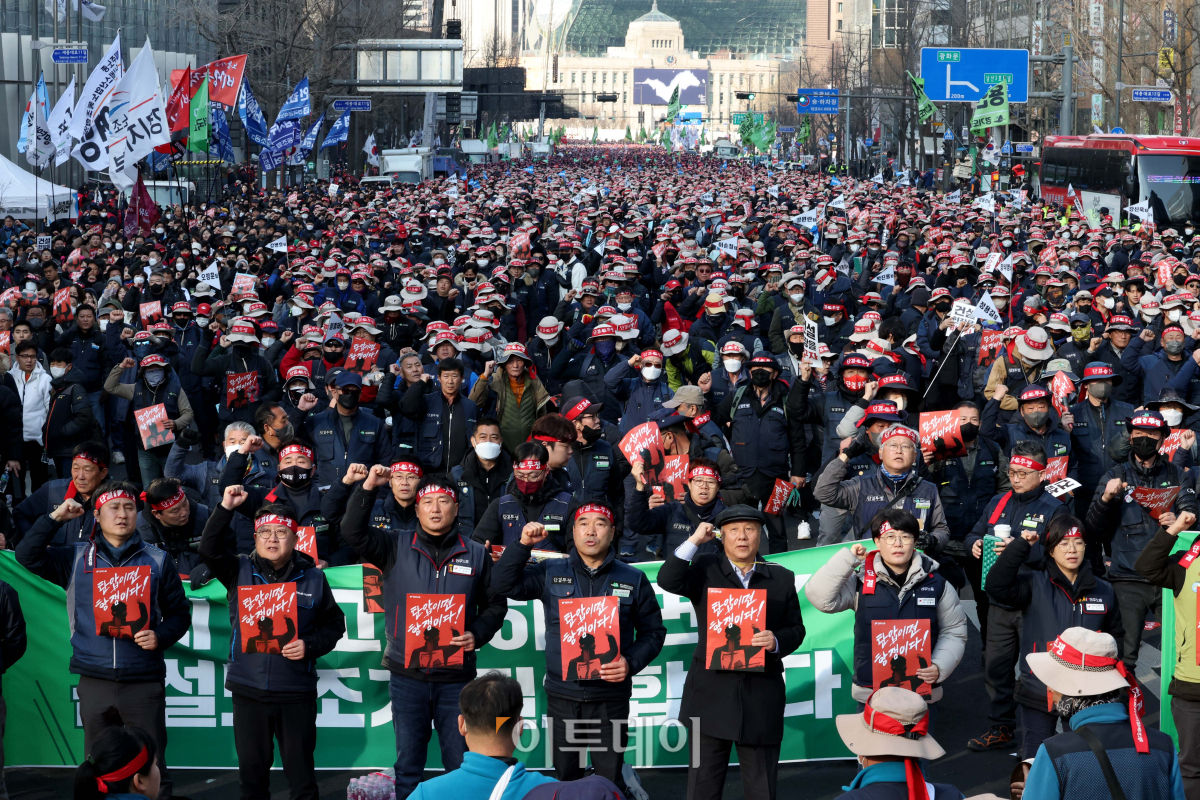 28일 서울 세종대로 일대에서 전국민주노동조합총연맹(민주노총) 전국건설노동조합 조합원들이 ‘건설노조 탄압 규탄 민주노총 결의대회’를 갖고 있다.