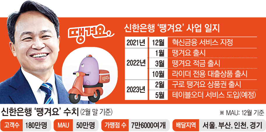 낮은 수수료와 함께 땡겨요의 차별점은 금융과의 연계다. 신한은행의 우수한 금융 인프라를 배달앱에 연결해 이용자들에게 다양한 금융 혜택을 제공한다. 1금융권 최초로 라이더 전용 대출상품을 출시하면서 라이더 업계에서 큰 인기를 끌고 있다.