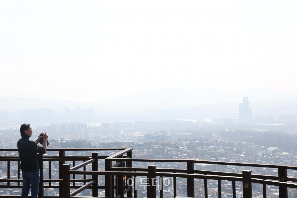 절기상 ‘경칩(驚蟄)’인 6일 전국이 포근한 날씨를 보인 가운데 서쪽지역을 중심으로 미세먼지가 ‘나쁨’ 수준을 나타냈다. 이날 서울 남산에서 바라본 도심이 미세먼지로 뿌옇다.