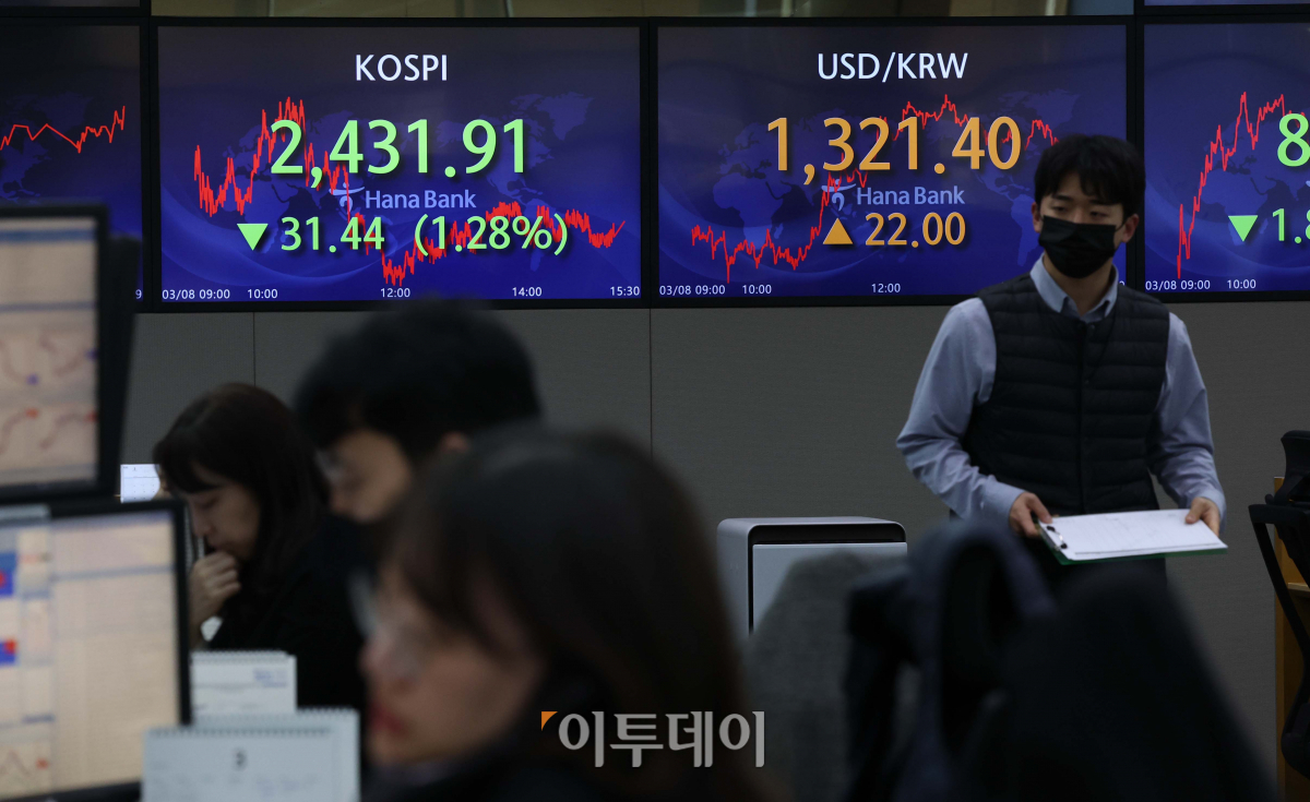 제롬 파월 미국 연방준비제도(Fed·연준) 의장의 매파(통화긴축 선호)적 발언 여파로 8일 원·달러 환율이 20원 넘게 급등했다. 이날 서울 중구 하나은행 딜링룸 전광판에 코스피와 원·달러 환율이 전 거래일보다 31.44포인트(1.28%) 내린 2431.91과 22.00원 오른 1321.40원을 각각 가리키고 있다.
