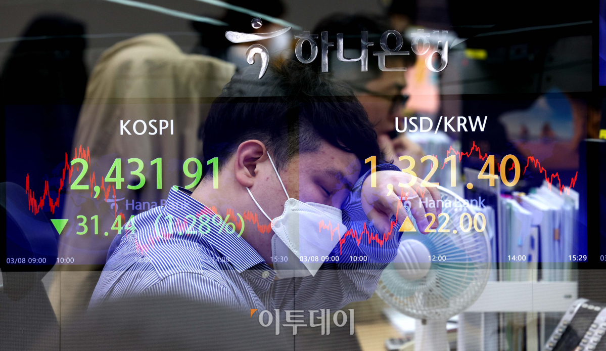 제롬 파월 미국 연방준비제도(Fed·연준) 의장의 매파(통화긴축 선호)적 발언 여파로 8일 원·달러 환율이 20원 넘게 급등했다. 이날 서울 중구 하나은행 딜링룸 전광판에 코스피와 원·달러 환율이 전 거래일보다 31.44포인트(1.28%) 내린 2431.91과 22.00원 오른 1321.40원을 각각 가리키고 있다.
