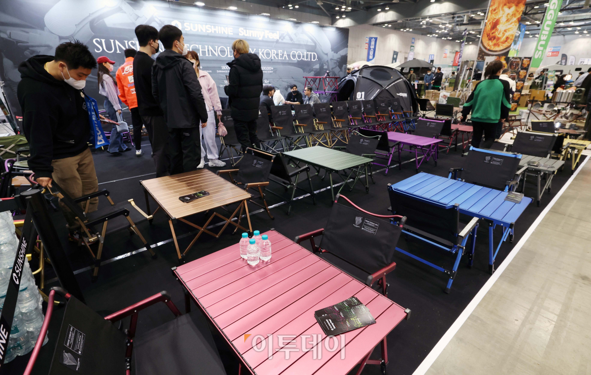 9일 경기 고양시 킨텍스에서 열린 ‘2023 캠핑·피크닉페어’ 에서 참관객들이 캠핑 의자를 살펴보고 있다. 이번 캠핑·피크닉페어에선 134개사 캠핑 전문 브랜드의 다양한 신제품이 전시됐다.
