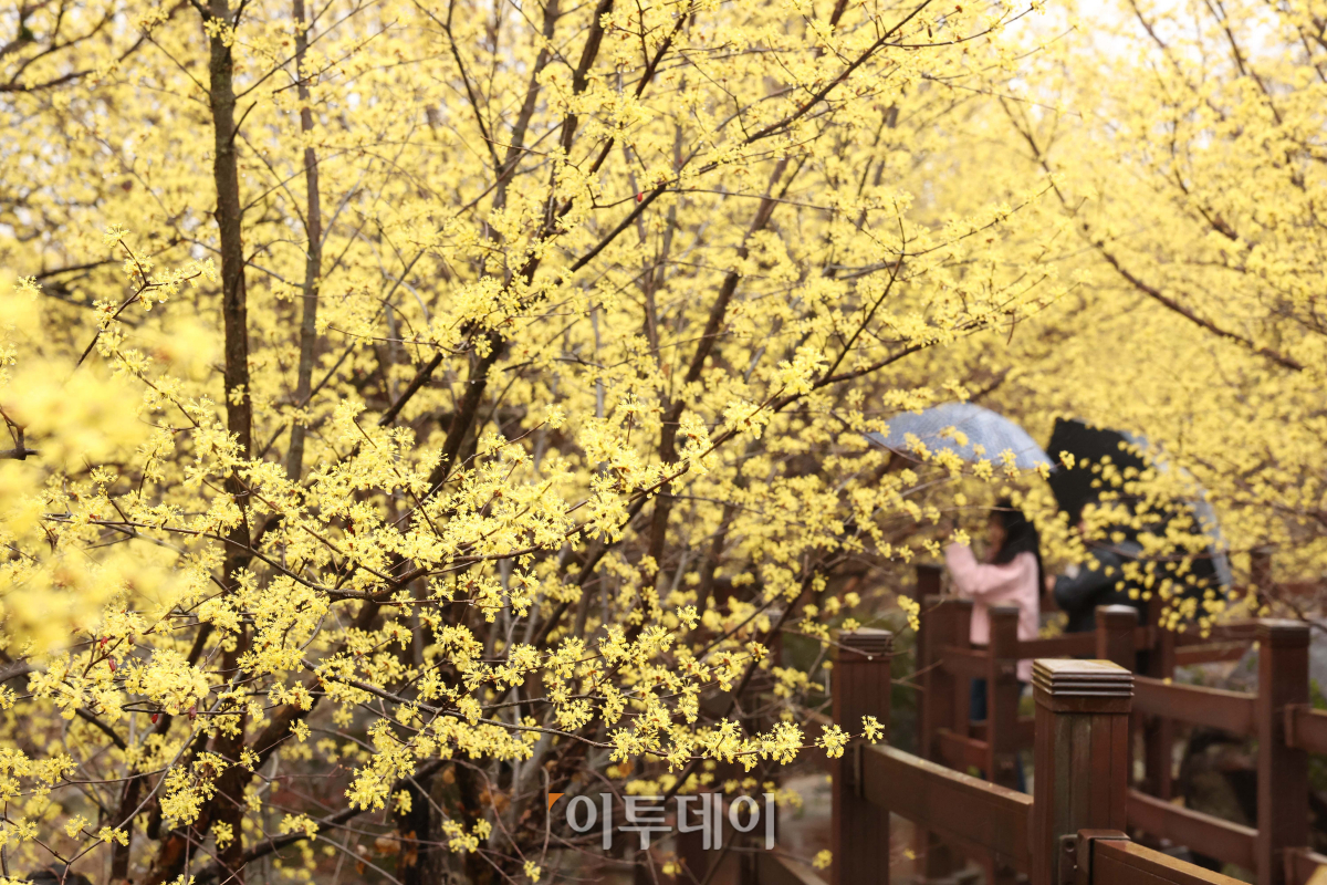 전국에 봄비가 내린 12일 전남 구례군 산동마을에 피어난 산수유꽃이 생동하는 봄기운을 전하고 있다. 구례 산동면 일대에선 19일까지 구례산수유꽃축제가 열린다.