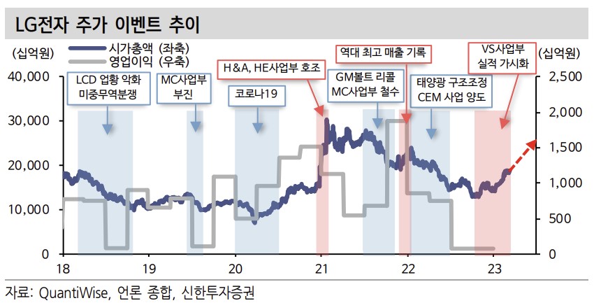 신한투자증권은 13일 LG전자에 대해 올해는 프리미엄 가전 카테고리 확장에 따른 해외 매출 확대, 2022년 VS 사업 실적 턴어라운드 이후 본격적인 성장이 기대되는 시기라며 투자의견 매수를 유지하고 목표주가를 기존 11만5000원에서 17만 원으로 47.83% 상향 조정했다. 전 거래일 기준 현재 주가는 11만5700원이다.