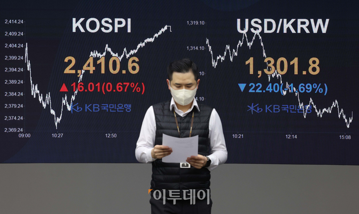 코스피가 미국 실리콘밸리은행(SVB) 파산 사태에도 금융시장에 미치는 영향은 제한적이라는 전망에 힘입어 상승 마감했다. 13일 서울 여의도 KB국민은행 딜링룸 전광판에 코스피와 원·달러 환율이 전 거래일보다 16.01포인트(0.67%) 오른 2410.6과 22.40원 내린 1301.8원을 각각 가리키고 있다.
