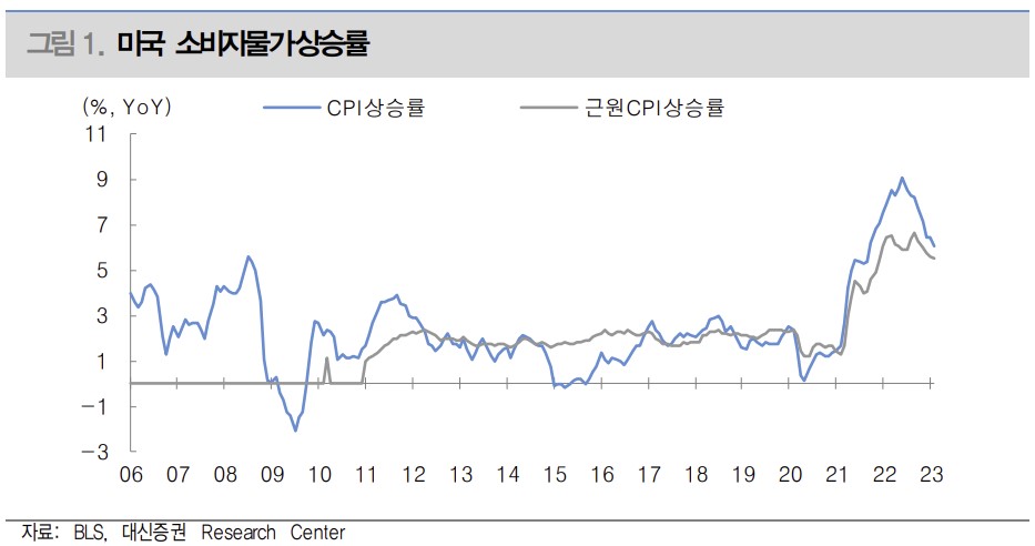 15일 대신증권은 "2월 미국 CPI상승률은 YoY +6.0%, MoM +0.4%로 예상치와 부합하는 수치를 기록했다. 다만, 근원 CPI 상승률은 YoY +5.5%, MoM +0.5%로 예상치(YoY +5.5, MoM +0.5%)를 소폭 상회하면서 전월(MoM +0.4%)보다 상승세가 강화됐다"며 "비탄력적 CPI도 YoY +6.5%로 2개월 연속 상승폭이 확대되는 모습을 보이면서 예상보다 강한 물가 하방 경직성을 보여줬다"고 평가했다.