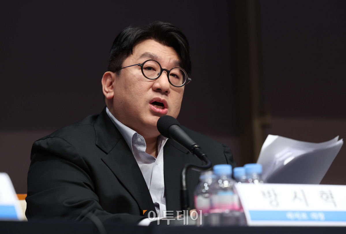 방시혁 하이브 의장이 15일 서울 중구 프레스센터에서 열린 관훈포럼에서 기조연설을 하고 있다.