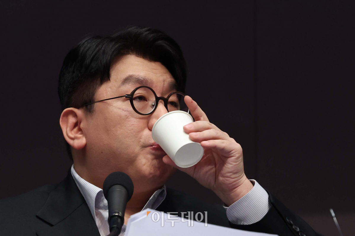 방시혁 하이브 의장이 15일 서울 중구 프레스센터에서 열린 관훈포럼에서 물을 마시고 있다.