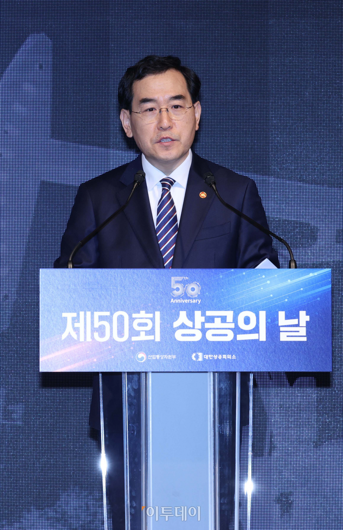 15일 서울 중구 대한상공회의소에서 열린 제50회 상공의 날 기념식에서 이창양 산업통상자원부 장관이 축사를 하고 있다.
